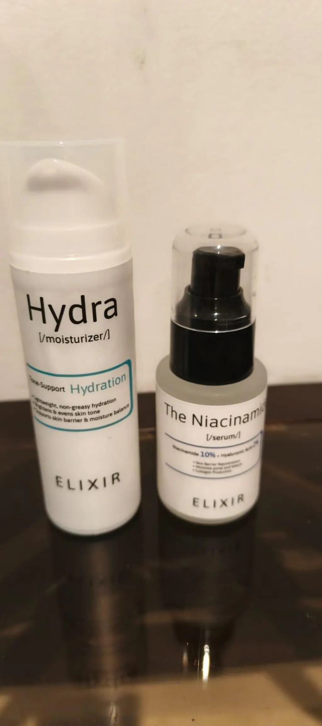 The Niacinamide by ELIXIR Serum helps manage oil, improve barrier function, and reduce the look of acne marks, while Hydra by ELIXIR seals in hydration and supports skin comfort without heaviness.